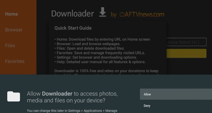 The first time you open Downloader it asks for storage permission. Allow it. Without this permission it can’t save the APK file to your device during download.